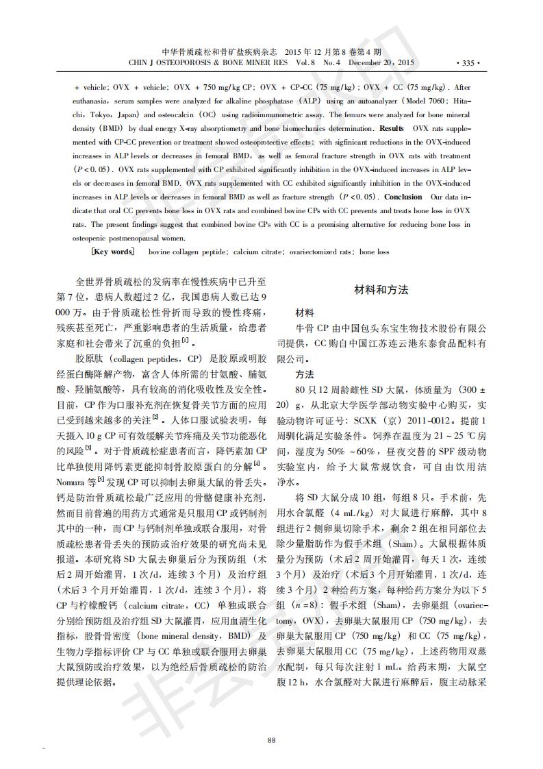 骨胶原肽与柠檬酸钙对去卵巢大鼠骨丧失的预防及治疗效果